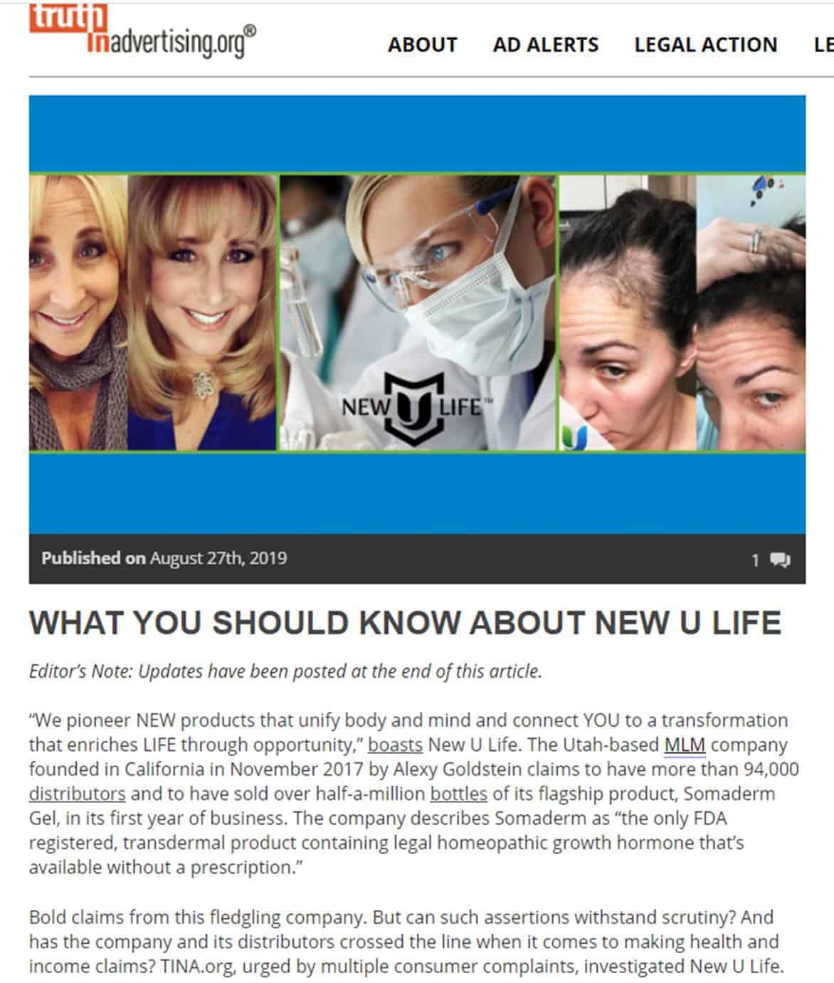 有沒有可能是同業惡意造謠? 當然有可能,但是不管是同業惡意造謠,還是真有其事,不去調查清楚就盲目相信(不管是相信同業造謠,還是真有官司),是很危險而且不明智的。到底有沒有官司,你只要上網搜尋new u life lawsuit,就會看到TINA.org(Truth in Advertising廣告的真相)以及BBB National Program,關於SOMADERM官司的相關報導。